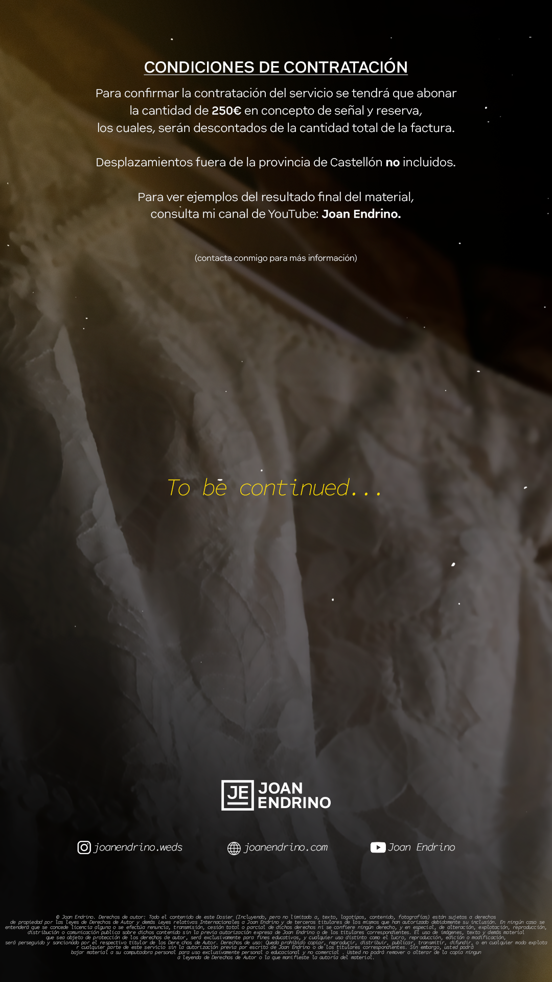 © Joan Endrino. Derechos de autor:Todos los contenidos de este Sitio (Incluyendo, pero no limitado a, texto, logotipos, contenido, fotografías, audio, botones, nombres comerciales y vídeo) están sujetos a derechos de propiedad por las leyes de Derechos de Autor y demás Leyes relativas Internacionales a Joan Endrino y de terceros titulares de los mismos que han autorizado debidamente su inclusión.En ningún caso se entenderá que se concede licencia alguna o se efectúa renuncia, transmisión, cesión total o parcial de dichos derechos ni se confiere ningún derecho, y en especial, de alteración, explotación, reproducción, distribución o comunicación publica sobre dichos contenido sin la previa autorización expresa de Joan Endrino o de los titulares correspondientes.El uso de imágenes, fragmentos de videos y demás material que sea objeto de protección de los derechos de autor, será exclusivamente para fines educativos e informativos, y cualquier uso distinto como el lucro, reproducción, edición o modificación, será perseguido y sancionado por el respectivo titular de los Derechos de Autor.Derechos de uso:Queda prohibido copiar, reproducir, distribuir, publicar, transmitir, difundir, o en cualquier modo explotar cualquier parte de este servicio sin la autorización previa por escrito de Joan Endrino o de los titulares correspondientes. Sin embargo, usted podrá bajar material a su computadora personal para uso exclusivamente personal o educacional y no comercial limitado a una copia por página. Usted no podrá remover o alterar de la copia ninguna leyenda de Derechos de Autor o la que manifieste la autoría del material.